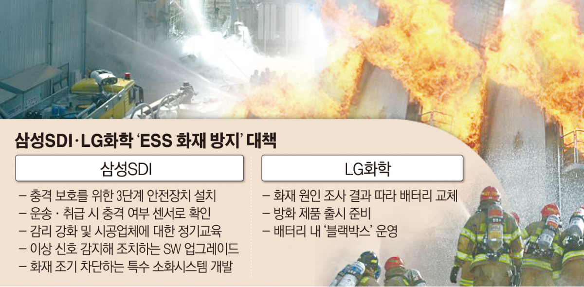 최근 삼성SDI는 ESS 화재 확산을 차단하기 위해 특수 소화 시스템을 ESS 시스템을 도입해 적용하겠다는 대책을 발표했다. LG화학도 화재 확산 위험성을 차단하는 ESS 제품 출시를 준비하고 있다는 입장을 밝혔다.