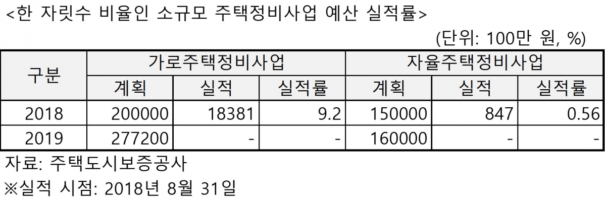 소규모주택정비사업 예산 총액 3500억 원의 5.5%인 269억 원만 사용됨에 따라 예산을 과다 책정했다는 지적을 피하기 어렵게 됐다. 그럼에도 내년도 예산안은 더 늘어날 예정이다. 가로주택정비가 772억 원 증액한 2772억 원, 자율주택정비는 100억 원 증액한 1600억 원으로 편성된다.