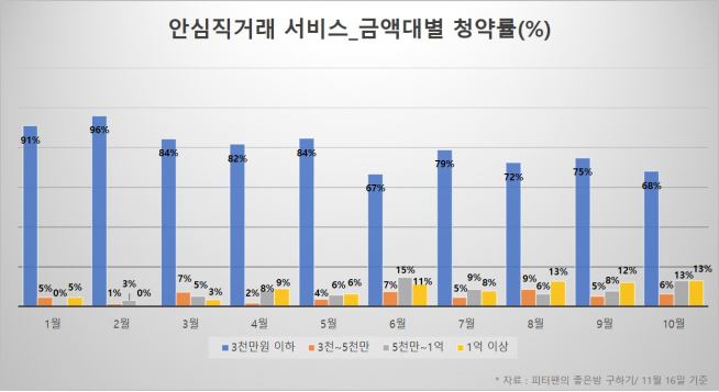 반면 1억 원 이상 구간은 올해 후반으로 갈수록 상승세가 높다. 5월까지는 최저 0%에서 최고 9%정도 였던 비율이 6월부터는 11%로 10%대를 넘어가며 10월에는 최고 13%까지 비중이 높아졌다. 실제로 올해 안심직거래 서비스를 신청한 가장 높은 금액의 임대차계약은 올 6월 거래된 5억5천만 원의 전세계약이다.