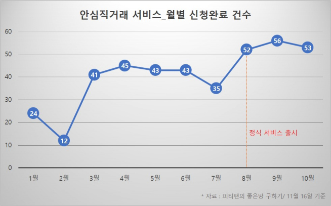 안심직거래 서비스는 올 1월부터 이사철, 신학기 등 계절적 성수기를 타며 3월 봄 시즌 이후 40건이 넘는 계약을 체결했다. 4월 최고 45건까지 높아졌다가 7월 여름 비수기에는 35건으로 떨어졌다.