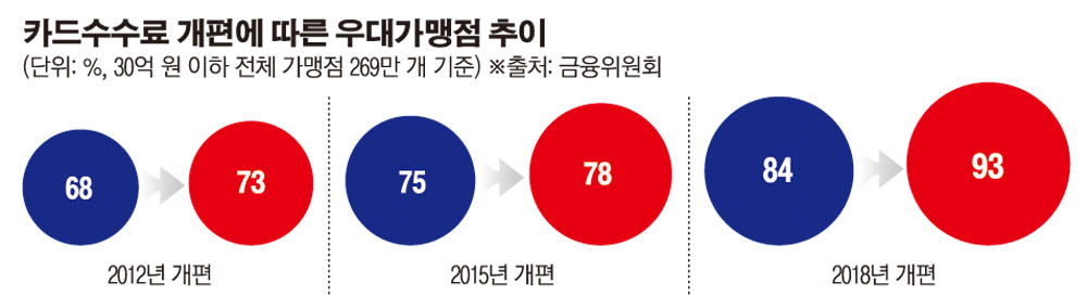 가맹점들이 받는 혜택이 크지 않다는 목소리도 커지고 있다. 연매출 5억∼10억 원 구간의 19만8000개 가맹점이 한 달에 더는 부담은 12만 원이다. 10억 원∼30억 원 구간의 4만6000개 가맹점은 월평균 42만 원의 수수료 부담이 줄어든다.