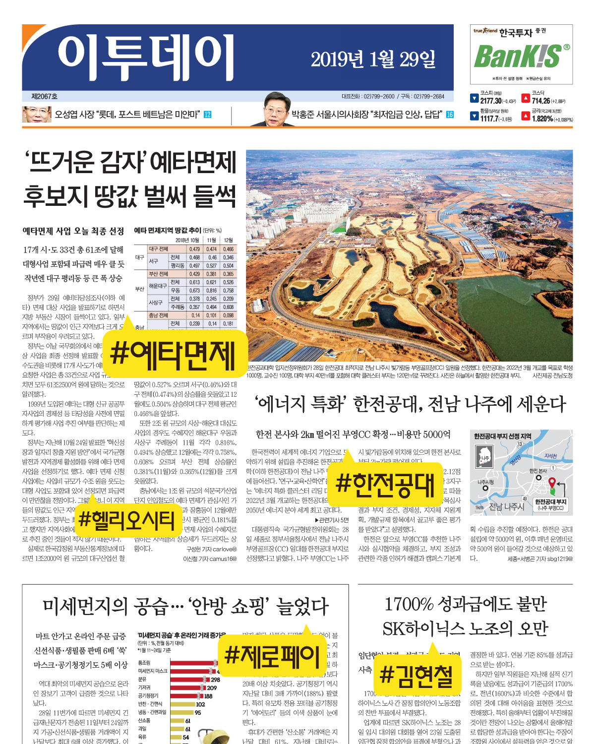오늘(29일) 이투데이에서는 조간 주요 뉴스로 ‘뜨거운 감자 예타면제 후보지 땅값 벌써 들썩’, ‘에너지특화 한전공대, 전남 나주에 세운다’, ‘김현철 “문재인정부 반기업 아냐”…재계 싸늘’, ‘홍종학 “제로페이보다 좋은 결제수단 나오면 사업 접겠다”’, ‘1만 가구 헬리오시티, 입주 대란 현실화 우려’ 등을 꼽아 봤다.
