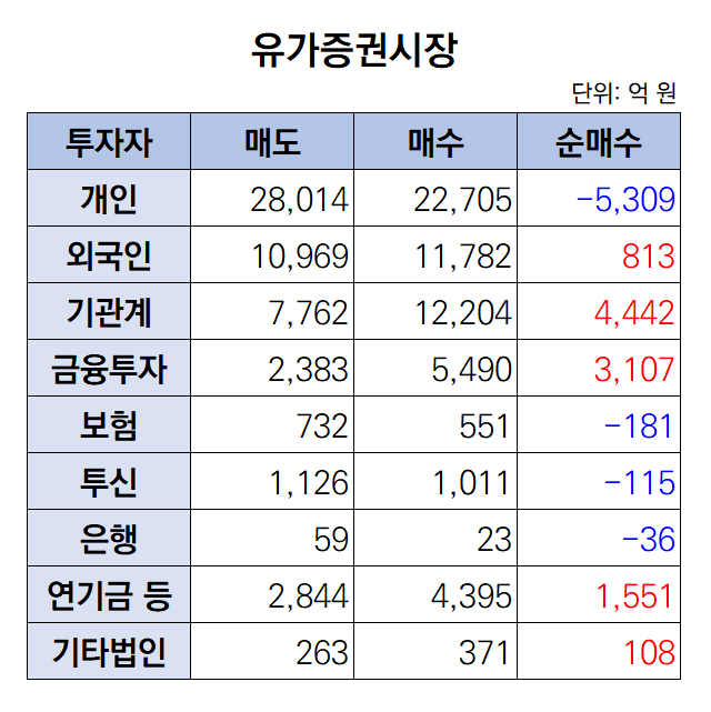 이날 외국인과 기관은 각각 813억 원, 4442억 원 규모를 순매수하며 주가를 끌어올렸다. 반면 개인은 홀로 5309억 원 어치를 순매도했다.