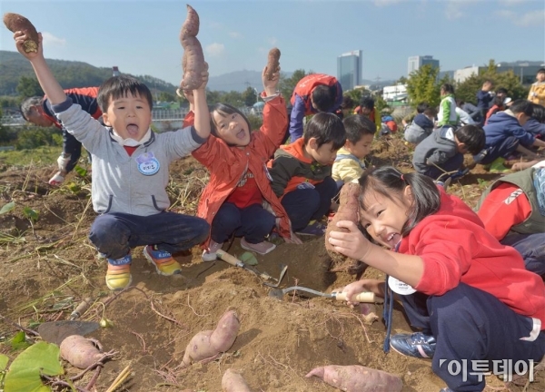 서초구는 내곡동 주민과 어린이집 원아 등이 참여해 고구마를 캐고 순을 따는 행사를 가졌다. 16일 서울 내곡동 사랑의 밭에서 열린 ‘고구마 캐기 체험 행사’에서 어린이들이 고구마를 캐며 즐거운 시간을 보내고 있다. 이날 수확된 고구마는 저소득가정 200세대와 관내 노인정 9개소 등에 전달될 예정이다. 신태현 기자 holjjak@