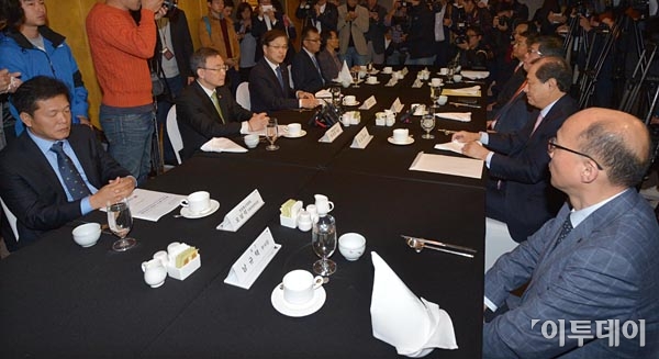 최양희 미래창조과학부 장관(왼쪽에서 세번째)이 17일 오전 서울 서초구 JW메리어트호텔에서 열린 이통3사와 휴대전화 단말기 제조사 사장단과의 간담회에 참석해 단통법 시행과 관련한 협조를 당부하고 있다. strongman55@