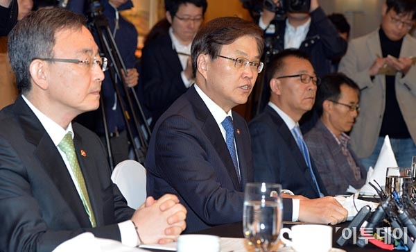 최양희 미래창조과학부 장관(왼쪽에서 두번째)이 17일 오전 서울 서초구 JW메리어트호텔에서 열린 이통3사와 휴대전화 단말기 제조사 사장단과의 간담회에 참석해 단통법 시행과 관련한 협조를 당부하고 있다. strongman55@
