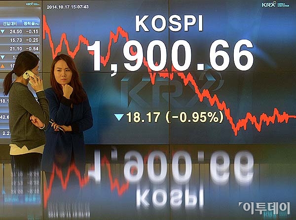 달러 강세와 기업 실적부진 등으로 코스피가 장중 1900선이 붕괴됐다. 이날 지수 종가는 전날보다 18.17포인트 하락한 1900.66을 기록했다. 17일 서울 여의도 한국거래소에서 직원들이 코스피 시황판을 보며 통화를 하고 있다. 신태현 기자 holjjak@