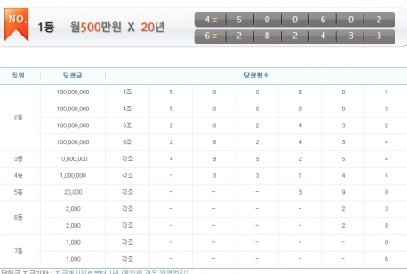 해당하는 번호다. 7등 당첨번호는 각조 맨 마지막 자리가 6과 0에 해당하는 번호다. 5등 당첨금은 2만원, 6등과 7등 당첨금은 각각 2000원과 1000원이다.