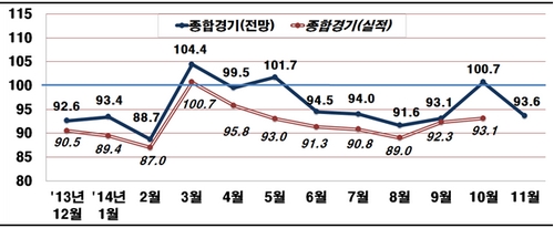 29일 전국경제인연합회가 매출액 기준 600대 기업을 대상으로 실시한 기업경기실사지수(BSI) 조사 결과에 따르면 11월 종합경기 전망치는 93.6을 기록해 기준선 100을 밑돌았다. 10월 전망치가 5개월 만에 기준선 100을 넘어선지 한달 만에 기준 이하로 내려간 셈이다.
