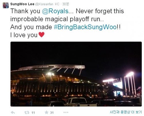 이성우씨는 30일(한국시간) 자신의 트위터에 “Thank you Royals. Never forget this improbable magical playoff run. And you made BringBackSungWoo. I love you(로얄스 고맙다. 이 놀라운 플레이오프는 절대 잊지 못 할꺼야. 그리고 날 다시 찾아줘서 고마워. 사랑해)”라는 멘트와 함께 캔자스시티 홈구장인 카우프먼 스타디움의 야경 사진을 올렸다.