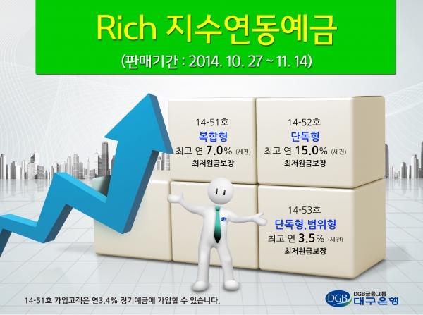 대구은행 관계자는 "이번 상품은 최근 주식하락장을 반영하여 주가 상승시 수익을 추구 할 수 있는 상품으로 구성했다"며 "원금을 보장하면서 수익을 추구할 수 있는 Rich지수연동예금은 저금리시대의 좋은 대안 상품이 될 것"이라고 밝혔다.