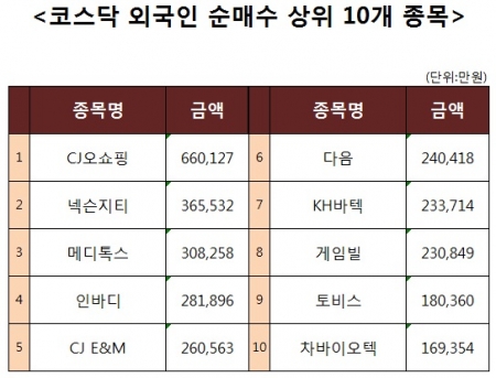 [코스닥 외국인 순매수 상위 10개 종목]