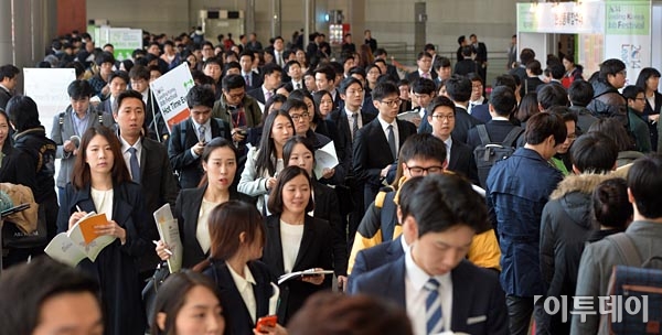 2014리딩코리아 잡페스티벌이 4일 서울 강남구 코엑스에서 열린 가운데 구직자들이 행사장으로 입장하고 있다. 최유진 기자 strongman55@