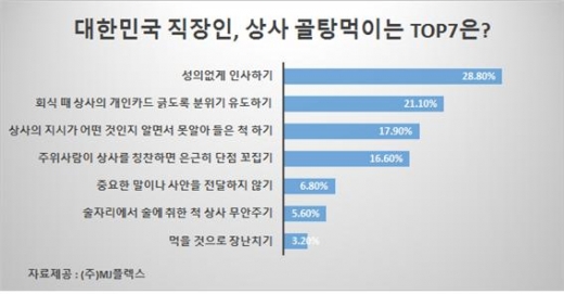 MJ플렉스에 따르면 얄미운 직장상사 골탕먹이는 방법 1위는 '성의 없게 인사하기'로 응답자의 28.8%를 차지했다. 뒤이어 '회식 때 상사의 개인카드 긁도록 분위기 유도하기'가 21.1%를 차지하며 2위에 올랐다. 3위는 '상사의 지시가 어떤 것인지 알면서 못 알아들은 척 하기'가 17.9%를 차지했다. 4위는 '주위 사람이 상사를 칭찬하면 은근히 단점 꼬집기(16.6%)'가, 5위 '중요한 말이나 사안을 전달하지 않기(6.8%)', 6위 '술자리에서 술에 취한 척 상사 무안주기(5.6%)', 7위 '먹을 것으로 장난치기(3.2%)'가 뒤를 이었다.