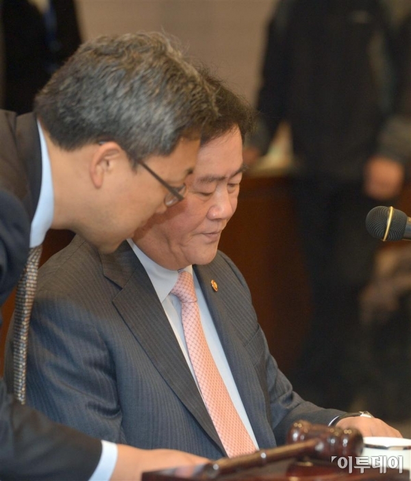 최경환 부총리 겸 기획재정부 장관이 5일 서울 명동 은행회관에서 열린 국가통계위원회에서 시작 전 보고를 받고 있다. 신태현 기자 holjjak@