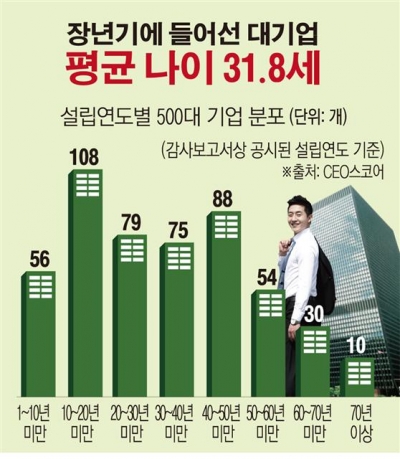 국내 대기업 평균 나이가 31.8세로 장년기에 접어들었다. 5일 CEO스코어에 따르면 매출 기준 국내 500대 기업의 설립 연도를 조사한 결과 평균 나이는 10년 전(26.9년)과 비교해 4.9년 늘어난 31.8년으로 나타났다. 설립 10년 미만인 56곳을 포함해 설립 20년 미만의 청년기업이 164곳(32.8%)으로 가장 많은 기업이 분포했고 40~50년 된 기업이 88곳(17.6%)으로 뒤를 이었다. 이어 20~30년 79곳, 30~40년 75곳, 50~60년 54곳, 60~70년 30곳으로 집계됐다.