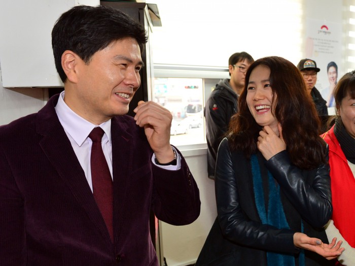11일 오후 서울 중구 한 건물에서 열린 중구무지개행복위 사무실 개소식에서 배우 심은하가 남편인 지상욱 전 자유선진당 대변인과 함께 참석자들과 인사를 나누고 있다.