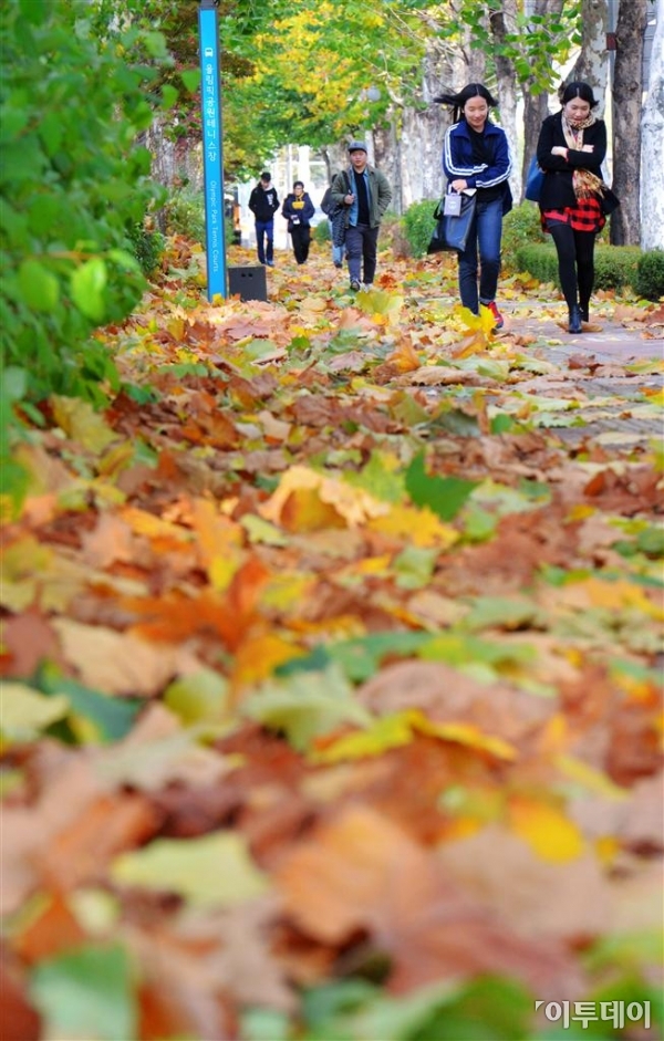 오전 내린 비로 기온이 큰 폭으로 떨어진 12일 서울 방이동 거리에 낙엽이 떨어져 있다. 한편 대학수학능력시험일인 13일은 일부 지역에서 아침 최저기온이 영하 7도까지 내려가는 등 ‘수능 한파’가 예상된다. 신태현 기자 holjjak@