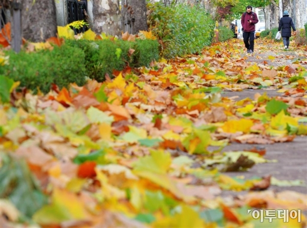오전 내린 비로 기온이 큰 폭으로 떨어진 12일 서울 방이동 거리에 낙엽이 떨어져 있다. 한편 대학수학능력시험일인 13일은 일부 지역에서 아침 최저기온이 영하 7도까지 내려가는 등 ‘수능 한파’가 예상된다. 신태현 기자 holjjak@