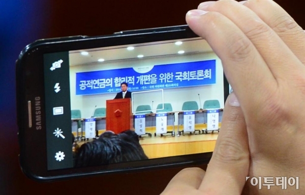 ‘공적연금의 합리적 개편을 위한 국회토론회’가 13일 오후 여의도 국회 의원회관에서 열렸다. 한 참석자가 스마트폰으로 토론회를 촬영하고 있다. 노진환 기자 myfixer@