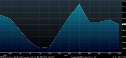 HSBC홀딩스와 영국 마르키트이코노믹스가 공동 집계한 11월 중국 제조업 구매관리자지수(PMI) 예비치가 50.0을 기록했다고 20일(현지시간) 블룸버그통신이 보도했다.