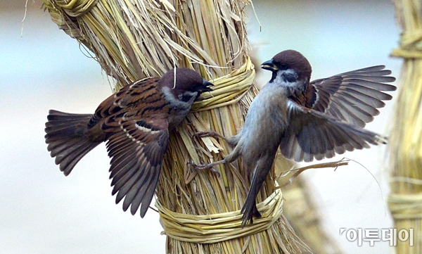 첫 눈이 내린다는 절기인 소설(小雪)을 하루 앞 둔 21일 서울 한 도로변 가로수에서 참새들이 동해예방을 위해 씌워놓은 볏짚에 달린 낱알을 차지하기 위해 다투고 있다. 최유진 기자 strongman55@