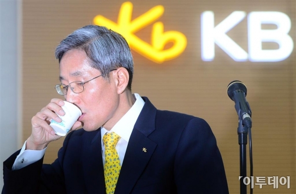 윤종규 KB금융지주 회장이 21일 오전 여의도 KB국민은행에서 열린 2014년 임시주주총회를 거쳐 신임 회장으로 공식 취임했다. 주주총회에 참석한 윤종규 신임 회장이 주주들의 질의에 답하며 물을 마시고 있다. 노진환 기자 myfixer@
