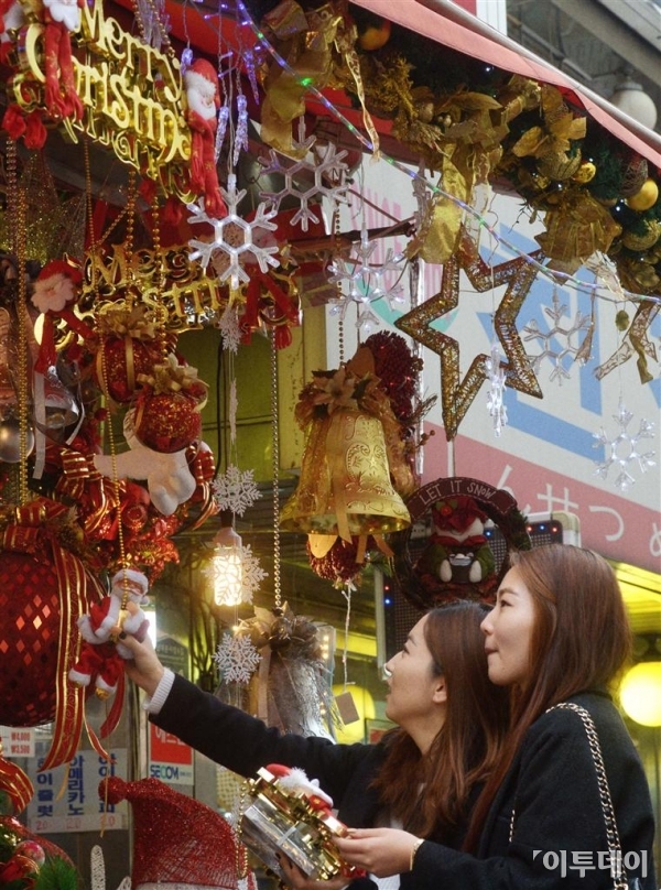 크리스마스가 한 달여 앞으로 다가온 23일 서울 회현동 남대문시장의 한 상점에서 시민들이 크리스마스 소품을 구경하고 있다. 신태현 기자 holjjak@