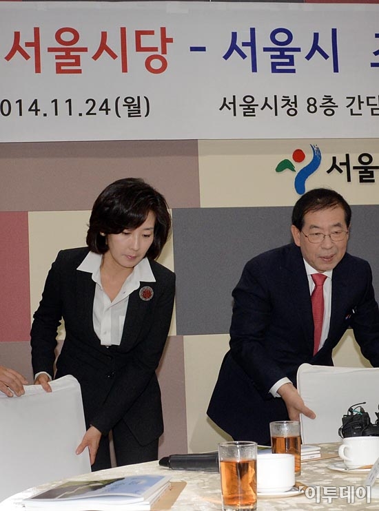 박원순 서울시장(오른쪽)과 나경원 새누리당 서울시당 위원장이 24일 오전 서울시청에서 열린 새누리당 서울시당-서울시 조찬간담회에 참석해 자리에 앉고 있다. 최유진 기자 strongman55@