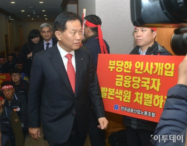 서진원 신한은행장이 24일 서울 명동 은행연합회관에서 열린 은행연합회 이사회에 참석하기 위해 ‘밀실 낙하산 인사 철회’ 집회 중인 금융노조 조합원들을 지나 회의실로 들어가고 있다. 한편 차기 은행연합회장 후보 추천을 앞두고 하영구 전 한국씨티은행장이 내정됐다는 소문이 돌면서 회장 선임과정에 대해 공정성 논란이 일고 있다. 신태현 기자 holjjak@