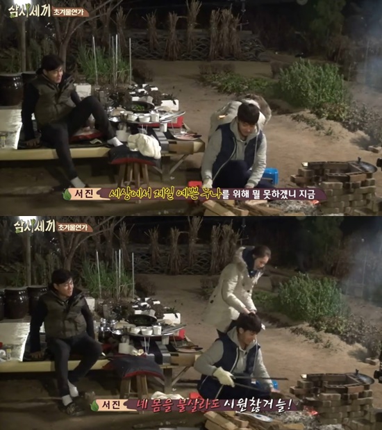 이날 ‘삼시세끼’에서는 손호준이 최지우에게 “지금까지 본 사람 중에 제일 예쁘다”고 해 핑크빛 분위기를 형성했다. 이에 자리를 정리하면서 이서진은 불을 지피고 있는 손호준에게 “세상에서 제일 예쁜 누나를 위해서 네가 뭘 못 하겠니. 네 몸을 불살라도 시원찮거늘”이라고 해 웃음을 안겼다.