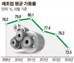 제조업 평균 가동률도 금융위기 여파가 불어 닥친 지난 2009년 5월(73.4%)이후 최저치인 73.5%를 나타냈다. 올해 8월 74%를 기록한 이후 불과 두 달 만에 최저치를 경신한 것이다. 특히 지난해 같은 기간보다 자동차(-13.8%), 반도체·부품(-6.5%) 등 수출 주력 품목에서 평균 가동률이 줄었다.