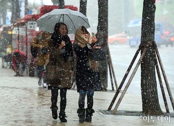 중부지역에 눈이 내린 1일 오전 서울 명동에서 관광객들이 사진을 찍고 있다. 기상청은 이날 전국이 대체로 흐리고 서울, 경기도와 강원도 영서, 경상북도 서부내륙은 아침부터 낮사이에 눈 또는 비, 충청남북도는 아침부터, 전라남북도는 낮부터 눈이 올 것으로 예보했다. 신태현 기자 holjjak@