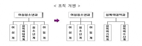 또 성범죄자를 종합적으로 관리하는 체계를 마련 등 예방정책도 전담한다. 성범죄 전력자의 재범방지를 위해 전담 관리인력 485명을 배치할 계획이다. 성폭력 피해자 보호를 위한 의료·법률 상담 지원에도 나선다.