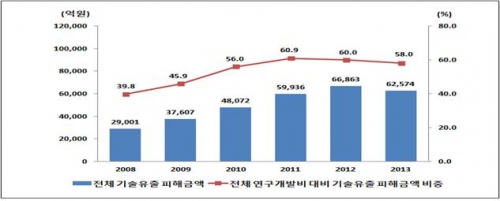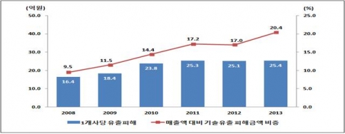 중소기업연구원이 조사한 ‘중소기업 기술보호 지원정책의 현황 및 과제’ 보고서에 따르면 기술유출 피해금액은 2008년 2조 9001억원에서 115.8% 늘어난 것으로 나타났다. 이는 중소기업 연간 전체 연구개발비의 58% 수준에 달한다.
