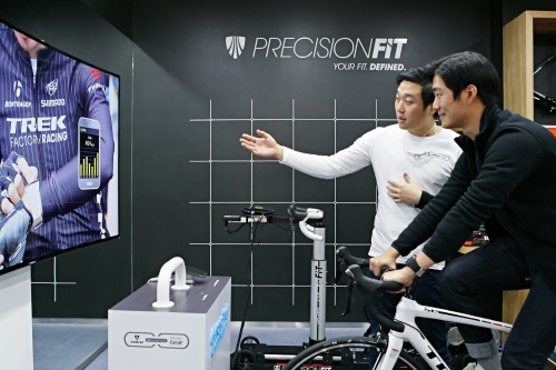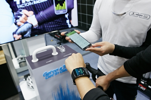 6일 서울 신사동에 위치한 트렉 매장을 방문한 고객들은 ‘삼성 기어S’와 ‘S헬스’ 애플리케이션을 통해 자전거를 타면서 거리, 속도, 심박 등을 측정해 라이딩 기록을 관리하는 기능을 체험했다.
