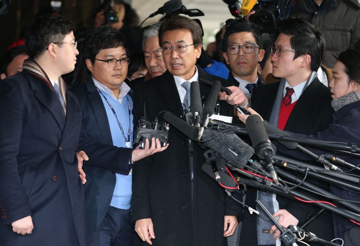 10일 '비선 실세'로 알려진 정윤회씨가 국정개입 의혹 문건을 보도한 세계일보에 대한 고소인 자격으로 서초동 서울중앙지검에 출두하고 있다. 이 날 검찰 출석 전 취재진과의 인터뷰에서 정윤회씨는 "박 대통령과 최근 접촉 없었다. 문건 내용은 사실이 아니다"라고 말했다.