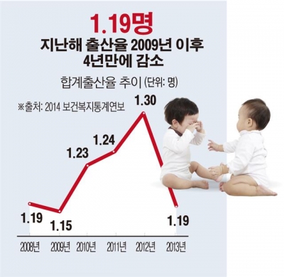 보건복지부가 10일 발간한 ‘2014 보건복지통계연보’에 따르면 한 여자가 평생 낳을 것으로 예상되는 평균 출생아 수를 뜻하는 합계출산율은 작년 1.19명이었다. 합계출산율은 2008년 1.19명에서 2009년 1.15명으로 떨어진 뒤 2010년 1.23명, 2011년 1.24명, 2012년 1.30명으로 증가 추세를 이어갔으나 작년에는 5년 전인 2008년 수준으로 다시 하락했다.