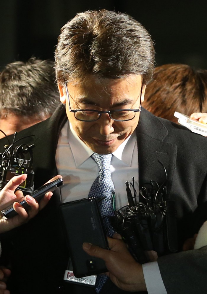 11일 '비선실세'로 거론된 정윤회씨가 서울 서초동 서울중앙지검에서 강도 높은 조사를 받은 뒤 청사를 나오던 중 취재진의 질문을 받고 있다. 정윤회씨는 청와대 문건의 골자인 비서진과의 비밀회동설에 관해 진술한 뒤 박관천 경정과 대질조사를 받았다.