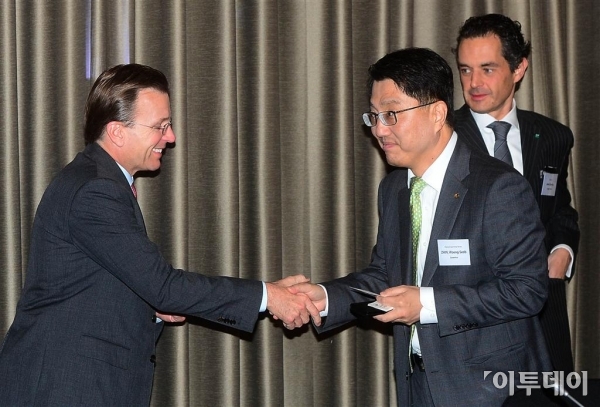 진웅섭 금융감독원장이 11일 오전 여의도 콘래드호텔에서 열린 외국계 금융회사 CEO 간담회에서 참석자들과 인사하고 있다. 노진환 기자 myfixer@