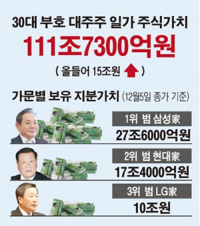 11일 기업 경영성과 평가사이트 CEO스코어에 따르면 상위 30대 부호가문 일가 728명의 지분가치는 전년의 96조2300억원보다 16.1% 증가한 111조7300억원 수준으로 집계됐다.