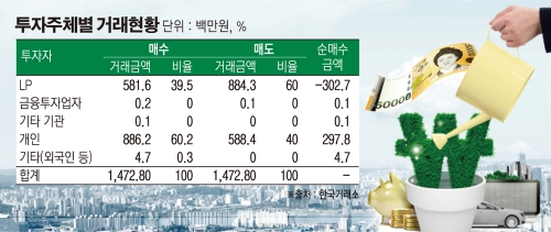투자주체별 거래 현황을 살펴보면 발행사(LP)와 개인이 거래의 대부분을 차지했다. LP가 49.7%, 개인이 50.1%의 거래비중을 차지한 반면 기관과 외국인, 기타법인 등은 0.2%에 불과했다.