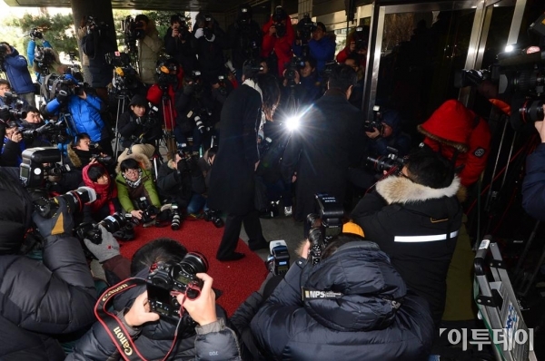 ‘땅콩 회항’ 사태로 물의를 일으킨 조현아 대한항공 전 부사장이 17일 오후 피의자 신분으로 마포구 서울서부지검으로 출석하고 있다. 조현아 전 부사장은 기자들의 질문에 고개를 숙인 채 ‘죄송합니다’라는 말 이외에는 아무 말이 없었다. 노진환 기자 myfixer@