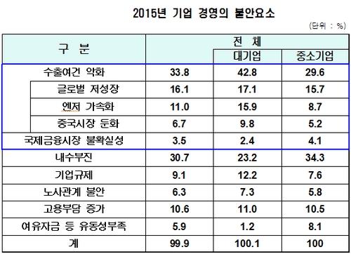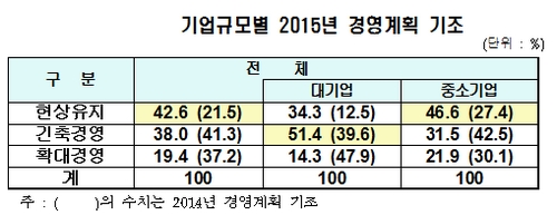 확대경영을 택한 곳은 대기업이 14.3%, 중소기업은 21.9%에 불과했다. 대기업 중에서는 긴축경영 기조를 택한 곳이 지난해 39.6%에서 올해 51.4%로 크게 늘었고 중소기업은 42.5%에서 31.5%로 감소했다. 전체적으로는 현상유지 기조를 설정한 기업이 42.6%로 가장 많았고 이어 긴축경영 38.0%, 확대경영 19.4% 순이었다.