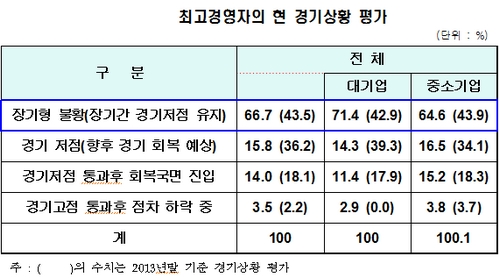현 경기상황에 대한 기업들의 우려도 심화돼 장기형 불황으로 평가한 기업은 66.7%로 작년(43.5%)보다 크게 늘었다. 경기저점이지만 앞으로 경기회복을 예상한 곳은 15.8%, 경기저점을 통과해 회복국면에 진입한 것으로 평가한 곳은 14.0%였다.
