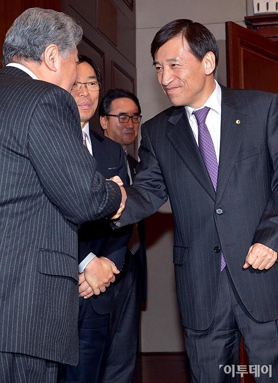 이주열 한국은행 총재(오른쪽)가 23일 서울 중구 한국은행 본관에서 경제동향간담회 참석자들과 인사를 나누고 있다. 최유진 기자 strongman55@