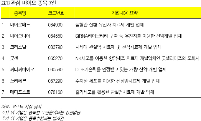 이외에도 크리스탈지노믹스, 굿센, 씨티씨바이오, 쓰리쎄븐, 메디포스트 등도 유망한 바이오 기업으로 꼽았다.