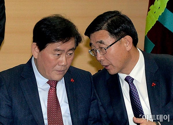 경제사회발전노사정위원회가 23일 오후 정부서울청사 노사정위 대회의실에서 87차 본위원회를 열고 '노동시장 구조개선의 원칙과 방향' 기본 합의안을 의결했다. 이날 최경환 경제부총리 겸 기획재정부 장관(왼쪽)과 이기권 고용노동부 장관이 대화를 나누고 있다. 최유진 기자 strongman55@
