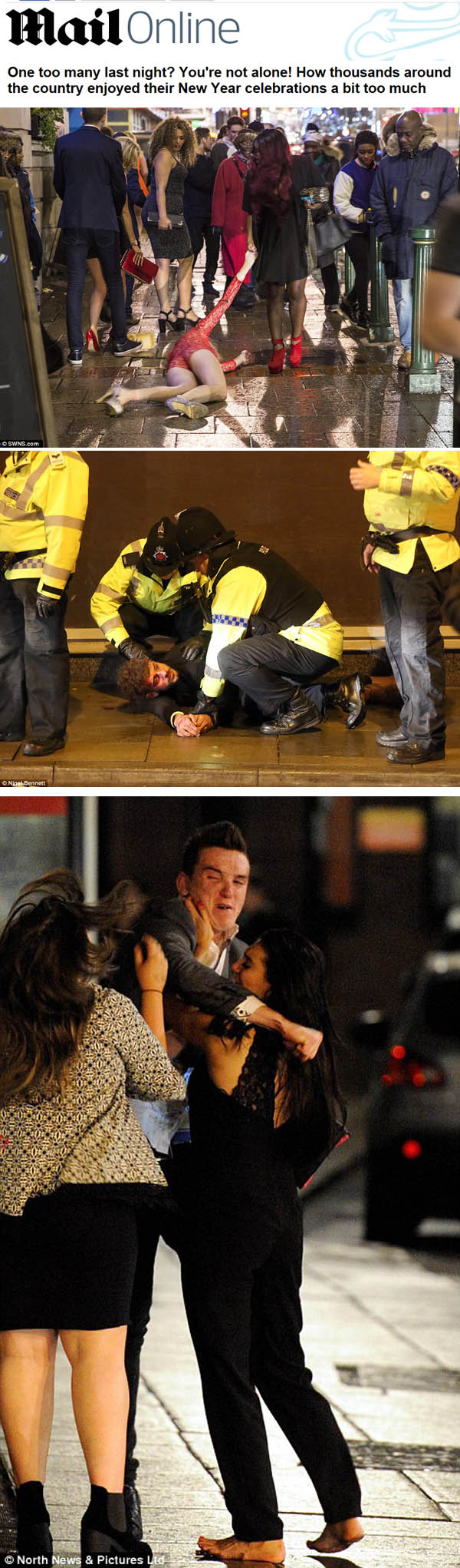 1일(현지시간) 영국 데일리메일은 지난달 31일 밤 영국 시내 곳곳에서 열린 새해 축하 행사 파티에서 술에 취해 추태를 부린 사람들을 보도했다. 보도에 따르면 런던 구급차 서비스는 자정 이후 15분 안에 100건 이상의 전화를 받았고, 수도권 지역 내 경찰은 이날 밤에만 폭행ㆍ약물ㆍ공공질서 위반 등의 혐의로 90명을 체포했다.