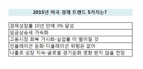 미국 경제 회복에 대한 기대감이 높아지고 있는 가운데 투자전문매체 마켓워치는 1일(현지시간) ‘2015년 미국 경제의 5가지 트렌드’를 선정해 보도했다.
